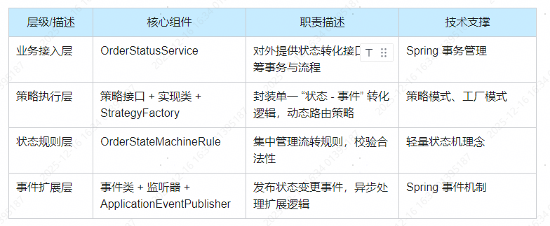 我在实际项目中开发了一套基于"事件驱动+策略模式+轻量状态机"的状态管理方案,有效解决了这些问题。这个方案的核心思想是将状态流转的规则管理、业务逻辑执行和扩展操作三个关注点进行分离,通过清晰的架构设计实现高内聚低耦合。