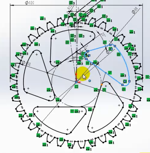作为一名有十年机械设计经验的工程师,我经常遇到需要绘制精密齿轮图形的需求。今天要分享的这个案例非常典型——一个包含36个齿的齿轮图形,看似简单却暗藏玄机。这个案例完美展示了SolidWorks草图环境中圆周阵列与修剪功能的配合使用技巧,特别是如何处理"修剪跳格"导致的欠定义问题,以及如何正确绘制不受约束的线。